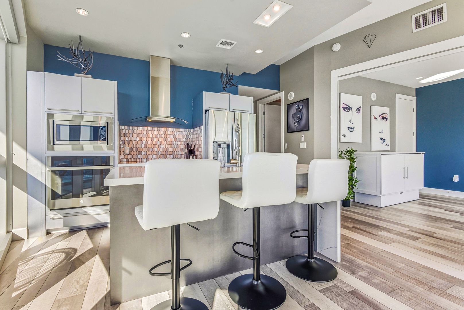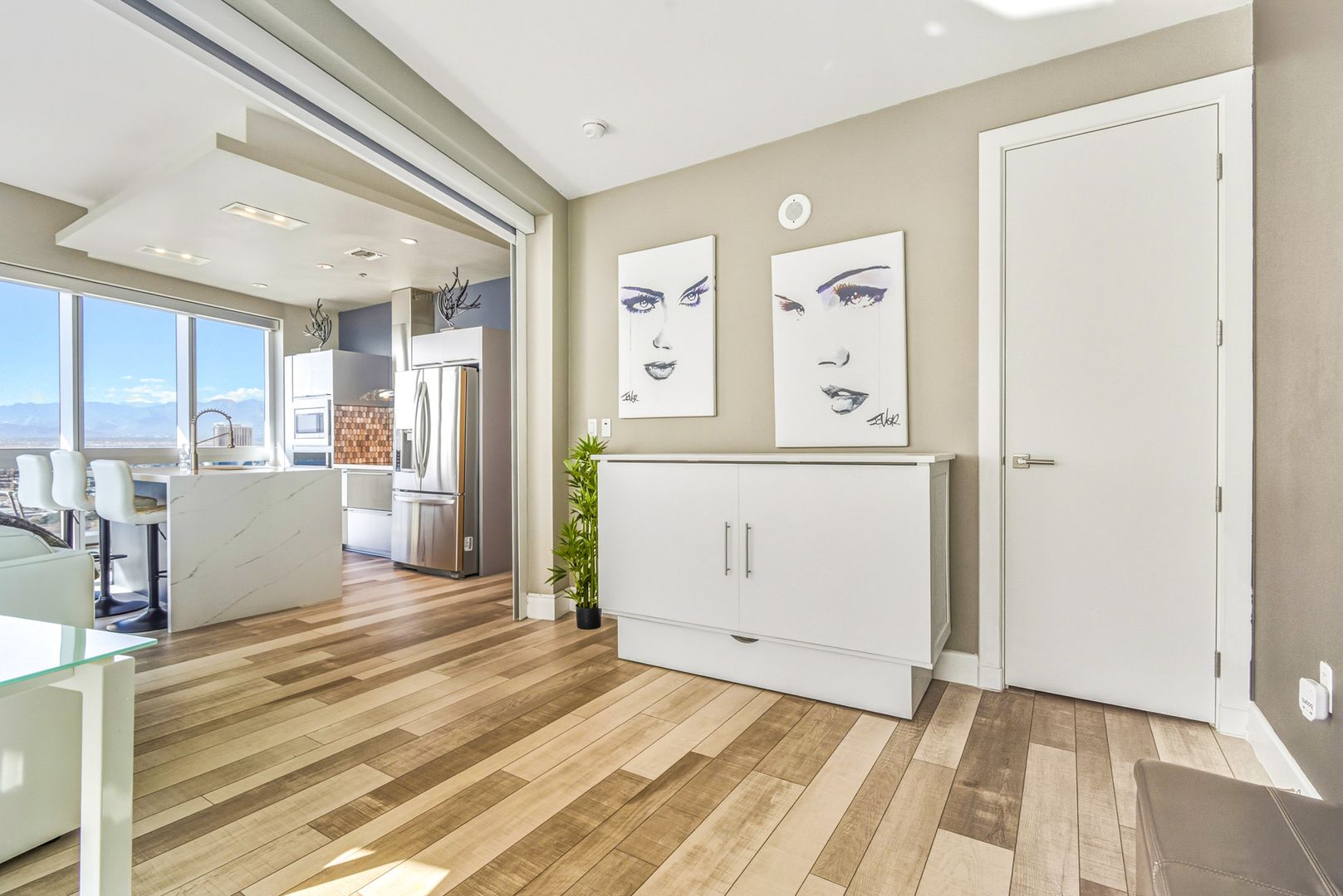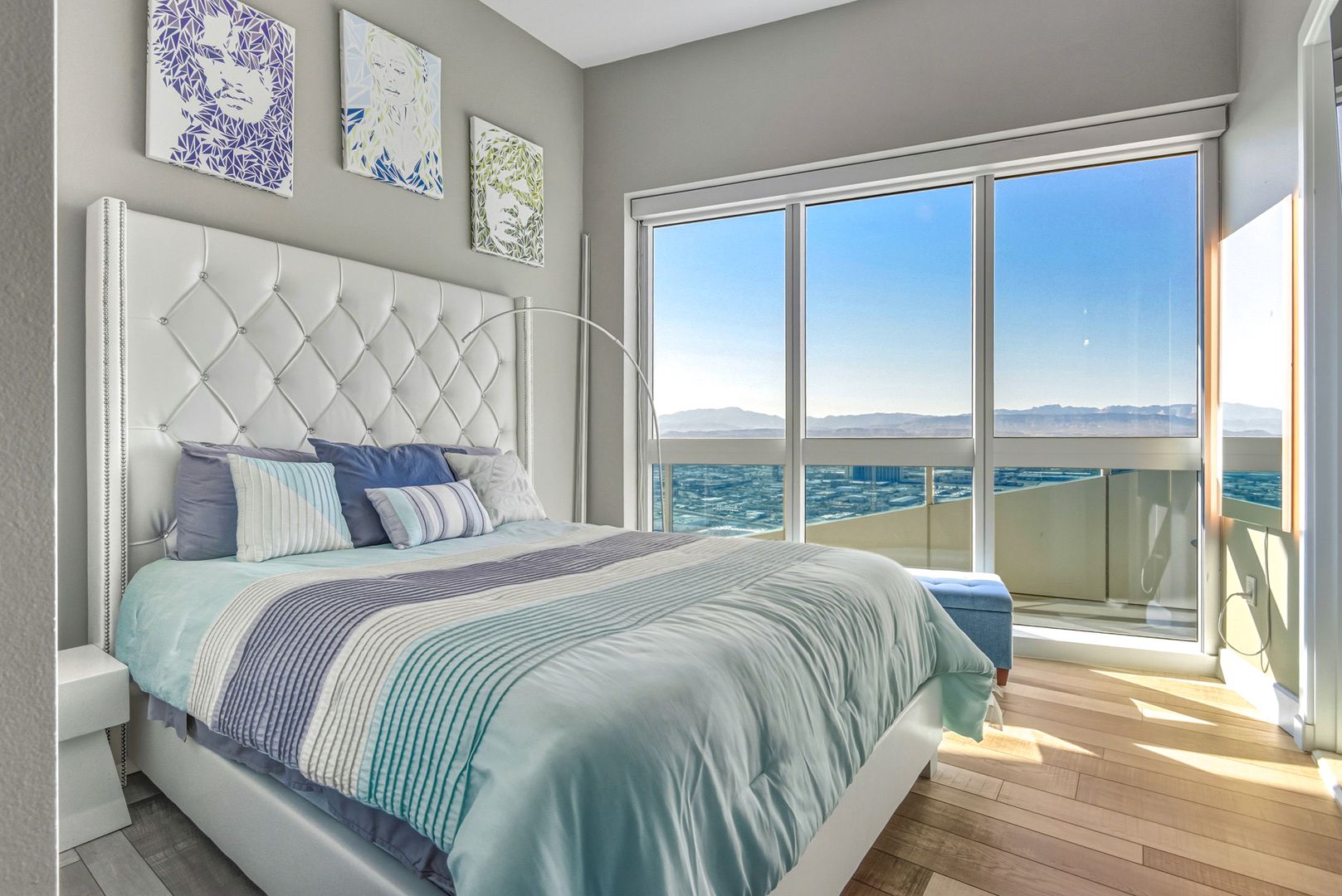 This fully furnished 1bd/2ba residence offers an elevated Las Vegas lifestyle with sleek high-rise living just moments from the Strip. This luxury condo features floor-to-ceiling windows that frame stunning city and mountain views, an open-concept layout ideal for entertaining, and refined modern finishes throughout. The gourmet kitchen is appointed with premium cabinetry and contemporary appliances, while the spa-inspired bathroom and spacious bedroom provide a serene private retreat. The den features, an electric shade wall, and a closet, allowing it to function as a second bedroom. Residents enjoy access to resort-style amenities, 24-hour security, and the convenience of being steps from world-class dining, entertainment, and nightlife.